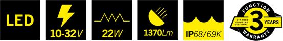 Låt inte den lilla storleken lura dig. Unity Ultra Flat arbetsljus är laddat med 1370 faktiska lumen och 6000 kelvin, och den breda ljusbilden når 1 lux @ 32 meter. Du kan vara säker på att du får maximal ljusstyrka där den verkligen behövs. Det är också ett bra alternativ för elektriska fordon då strömförbrukningen ligger på endast 22 watt, jämförbart med en blinkers.